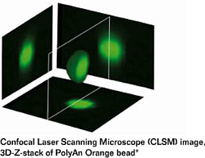 PolyAn’s microparticles can be color-encoded with up to six fluorescent dyes. The fluorophores are directly incorporated into the core of the bead during the microparticle formation. This ensures a much more homogeneous distribution of the dyes within the beads when compared to conventional diffusion controlled dyeing processes. Additionally, the fluorophores are caged within the polymeric PMMA matrix and thus less likely to leak-out. The homogenous distribution of fluorophores is illustrated in the adjacent CLSM image.