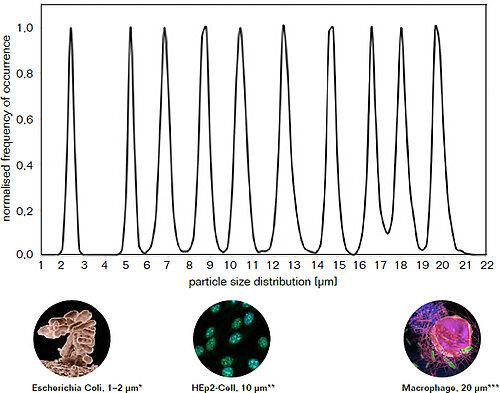 PolyAn produces microparticles in the range between 2 - 20 µm. Each bead population is monodisperse with a maximum Coefficient of Variation (CV) of less than 5%.