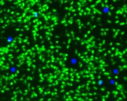 Focus beads (blue, DAPI channel) in combination with EPEC-bacteria on a GP2-coated plate. Only the surface of the bacteria has been dyed with O26 E.coli-antibody sera and FITC-conjugated secondary antibody.