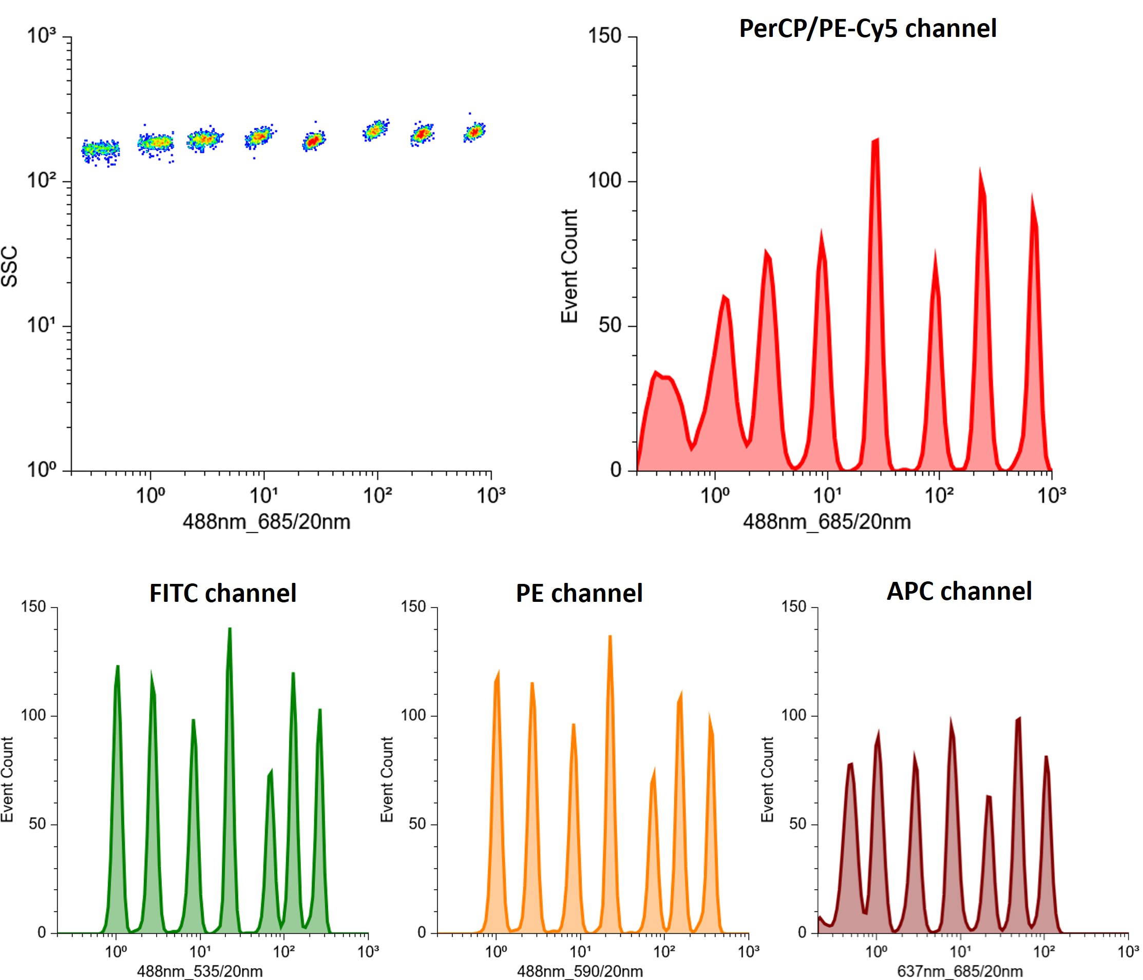 - Allows the calibration of the FITC, PE, PE-TR, PE-Cy5, and APC channels with the same set of particles.