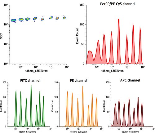 Spectrum Calibration Microbeads (8-peak) consisting of one transparent population (only detectable in the PerCP/PE-Cy5 channel, due to the low autofluorescence of PMMA) and 7 fluorescent populations with increasing fluorophore content for all detection channels (measured with a Quantum Analysis Quantum-P flow cytometer).