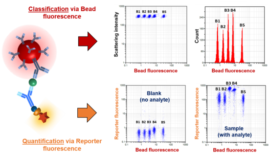 - Fluorescence microscope systems: Dual color-encoded Multiplex Beads - up to 18 populations of dual color encoded beads