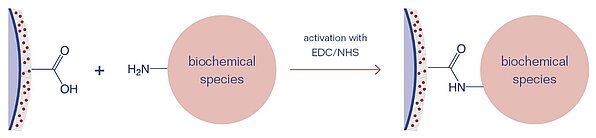The activation of Carboxyl groups with EDC (1-Ethyl-3-(3-dimethylaminopropyl) carbodiimide) and NHS (N-hydroxysuccinimide) leads to highly reactive esters, which can be easily reacted with nucleophiles, e.g. Amines or Hydrazines. The NHS-ester reacts with the NH²-groups of biochemical species to form a covalent bond with the surface.