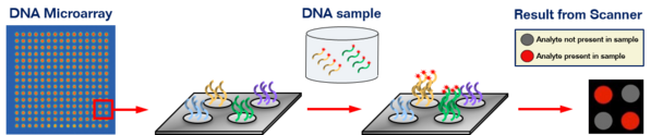 DNA Microarrays are two-dimensional arrays of DNA capture strands printed onto a solid substrate used to assay a large number of DNA variants within a sample for multiplexed high-throughput screening.