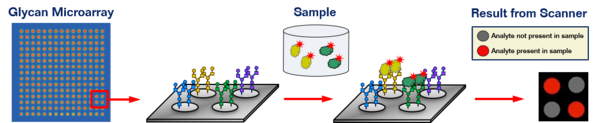 Glycan microarrays are presentations of multiple glycans or glycoconjugates printed on a slide for screening with glycan-binding proteins, e.g. lectins, antibodies, bacteria, and viruses.