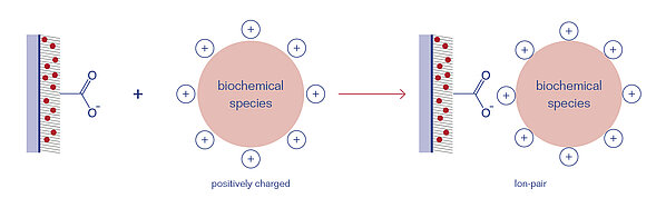 An adsorptive immobilization is a non-covalent coupling method onto solid supports which is realized by electrostatic and Van-der-Waals interactions as well as hydrogen bonds and hydrophobic interactions of the reactants. An electrostatic interaction is formed by an ion-ion-interaction between the surface and the applied biochemical species. The dissociation energy for typical electrostatic bond is 130 kJ/mol, which is about a third of the strength of an average covalent bond. In order to achieve an optimal adhesion the probe buffer und the adhesion conditions (pH value) have to be optimized.